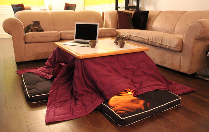 被爐就是我們經(jīng)常在日本電影里見(jiàn)到的,一個(gè)矮桌子,上面鋪著被子,桌子下面有類(lèi)似電暖氣一樣的取暖設(shè)備。天氣冷的時(shí)候,將身體蜷縮在被爐下面,就會(huì)覺(jué)得很暖和,睡個(gè)午覺(jué)也很溫暖舒服。
