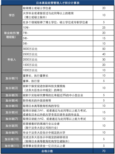 如果代表取締役是大學畢業,可以得到10分,那總分就達到75分了。如果代表取締役在過往的3-10年有連續的管理、職場經驗的話,還可以得到10-25分,那么總分就可以達到75分以上了。如果代表取締役同時是大學畢業或經營管理經驗達到5年以上,那么總分就可以超過80分,完全都達到了申請高度人才的標準。