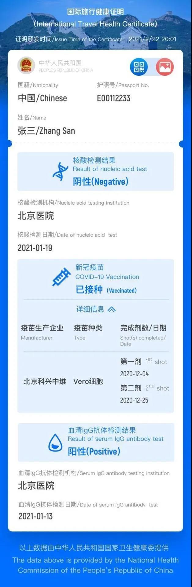 中國版“國際旅行健康證明”在充分保護個人隱私的前提下,能夠顯示持有人的核酸、血清IgG抗體檢測結果及疫苗接種情況等。健康證明內含加密二維碼,以供各國相關部門驗真并讀取個人相關信息,且還可以打印紙質版健康證明。