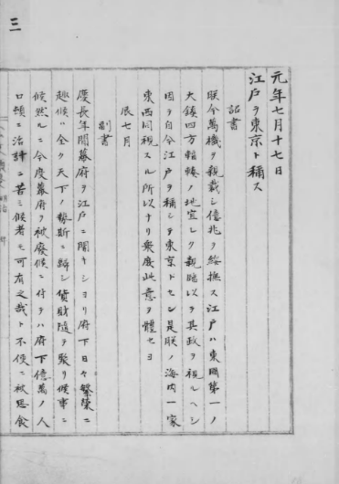 1868年(明治元年)日本天皇從京都遷移到江戶(也就是現在的東京)并發布詔書(江戸ヲ稱シテ東京ト為スノ詔書),將江戶稱為東京,在那個年代“京”和現代的“首都”一詞是同一個意思。根據這部詔書的內容,是把東京和京都并稱為首都。