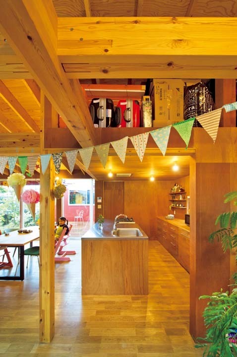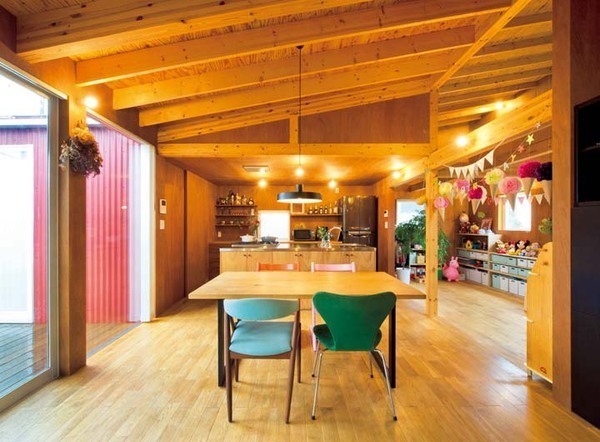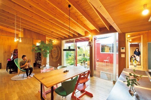 首先,將中庭圈成“コ”字的平房設計,這樣屋內所有的空間都能近距離感受到大自然的綠色和泥土的芬芳,不但光照充足,還能隨時享受與大自然融為一體的居住感受。中庭和房間連接在一起,高高的天花板營造出了更加開放的感覺。原本希望建造兩層樓的S夫婦覺得與原計劃相比,雖然整體的套內面積變小了,但是實際上也確保了足夠的居住面積。最讓人驚喜的是,房子內部設計為簡約的打通空間,方便孩子小時候的玩耍和大人照看孩子,等孩子長大時可以根據需要增加隔斷墻,變成相對私密的空間,挑高的屋頂甚至將來還可以增加閣樓空間,不失為匠心巧設。