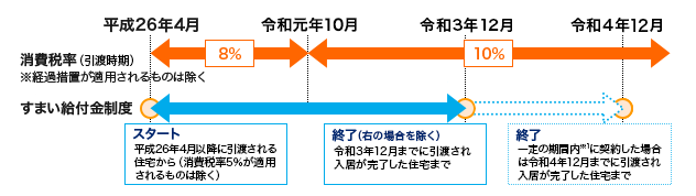 從消費稅率提高的平成26年4月以后交房,到令和3年12月31日為止交房并入住的住宅。是指消費稅率上調后購買的住宅(適用消費稅率5%及以下的住宅不在此列 )。部分在限定期間內簽約的40㎡以上的住宅,時間可放寬到令和4年12月31日前交房并入住的住宅。