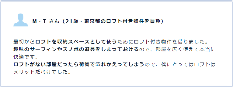 “從一開始就想把閣樓用作收納空間因此租了帶閣樓的房子。把喜愛的沖浪板和滑雪板凳用具收起來,房間就顯得寬敞住著也很舒服。如果是沒有閣樓的話,行李會多的沒地放,所以閣樓對我來說好處多多。”