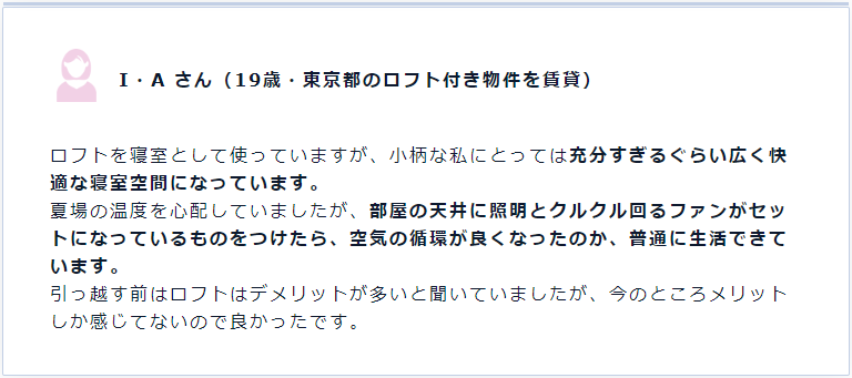 “對于身材嬌小的我來說,閣樓成為了足夠?qū)挸ㄊ孢m的臥室空間。夏天的溫度是有點擔(dān)心,如果在閣樓能安裝一套照明和空氣循環(huán)設(shè)備的話,正常生活就沒問題了。入住之前雖然聽說閣樓有很多缺點,但現(xiàn)在更多的感覺到了優(yōu)點所在,所以現(xiàn)在住著很好。”