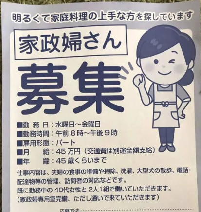 其次日本人比較獨立,認為自己家的事情當然自己做了,如果請保姆的話,除非是大集團的企業家,要不然可能會覺得“這人真懶”容易遭鄙視。當然企業家聘請保姆的費用絕對不低,比如某社長家招聘保姆的啟示:每周3~周5工作(3天)、早8點~晚9點、兼職、月薪45萬日元(交通費另付)、45歲左右、工作內容包括準備餐食、打掃、洗衣房、遛狗、接電話及來訪等、保姆2人1組配合工作。看到這份兼職保姆的招聘啟事,大概就能知道日本保姆的待遇了,全職或住家保姆的工資待遇更為優厚。由此也可以看出,在日本,普通人家著實請不起住家保姆。