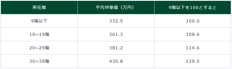 無論是租金或是購房價格,高級公寓的樓層越高、價格越貴是普遍的情況。根據日本某調查機構的結果顯示,2015年~2020年,30~39層新建高級公寓的平均坪單價如下所示。