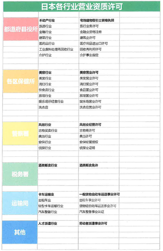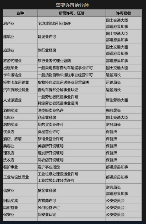 需要注意的是,在日本從事一些經營項目時,還需要獲得該行業資質。如經營民宿需取得民宿營業牌照、經營不動產中介公司需取得不動產買賣資質等。否則,即使營業范圍里寫明了,如果沒有行業資質時也無法運營該項目。以下便是在日本需要資質許可的行業及需要在哪里取得這些行業資質。
