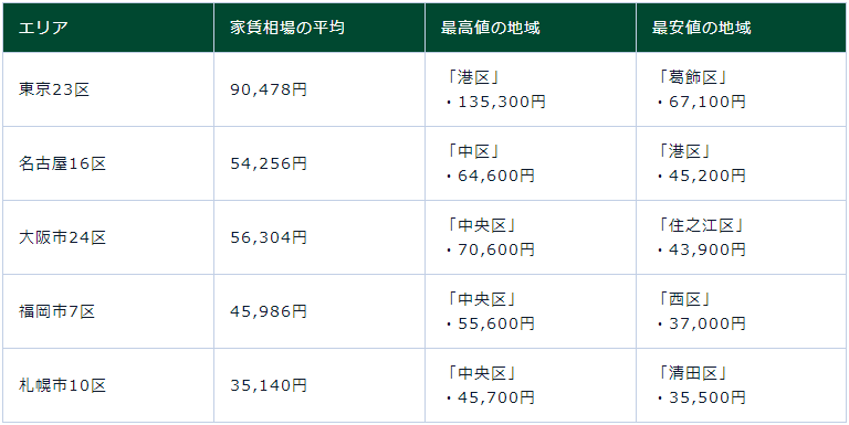 由上表可以看出,東京23區的平均月租金為90,478萬日元、名古屋16區的平均月租金為54,256萬日元、大阪市24區的平均月租金為56,304萬日元、福岡市7區的平均月租金為45,986萬日元、札幌市的10區平均月租金為35,140萬日元。