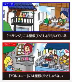 在一些戶型圖中,代表陽臺的詞語有三個,バルコニー(Balcony)、ルーフバルコニー( Roof balcony)、ベランダ(Veranda),這三個詞的意思有什么不同呢?