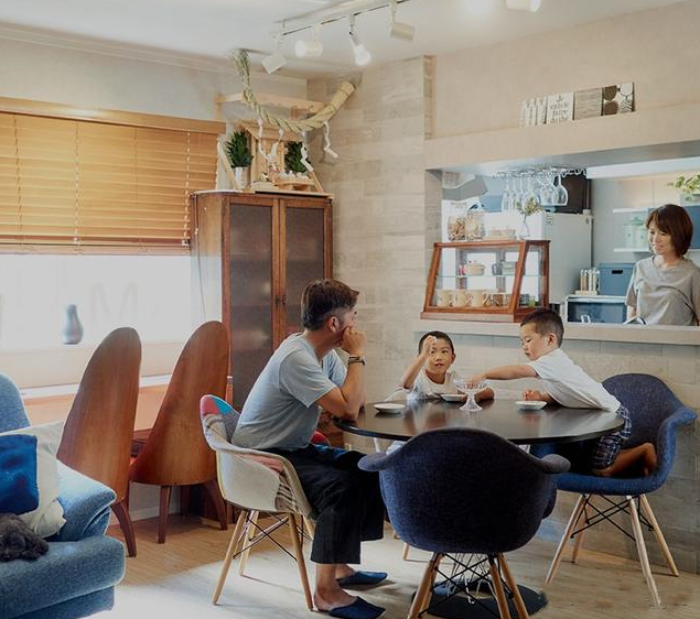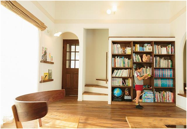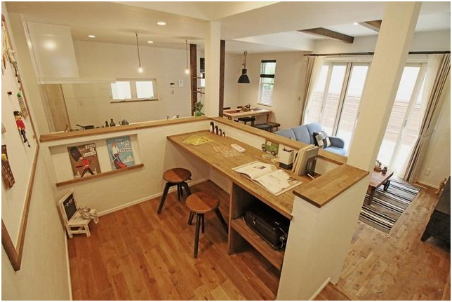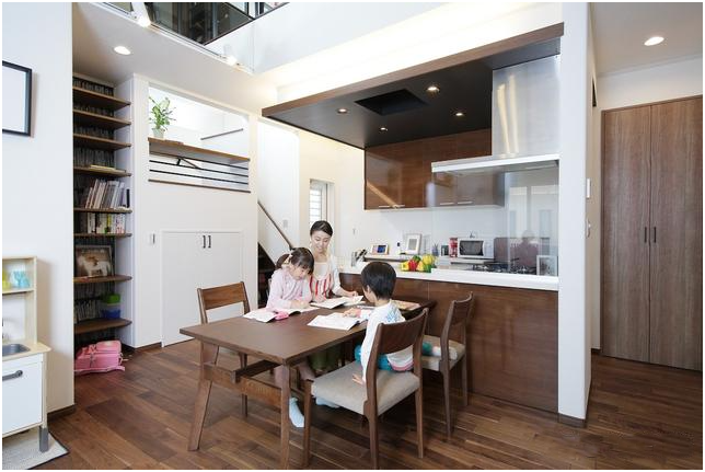 日本目前流行的起居室布局通常為“L”型或“I”型,設置有開放式廚房、就餐區及客廳區。這樣設計的好處是主婦們可以一邊做飯一邊照看孩子們。起初,一些孩子們喜歡在餐桌上學習,這樣媽媽在做飯時也可以“看著”孩子學習,而因為有了媽媽關注的目光,孩子們學習更有動力,學習效率自然高起來了。