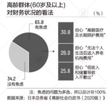 2020年的統計數據顯示,日本境內65歲及以上的老年人約有3617萬人,在日本1.26億總人口中所占的比例已高達28.9%,在全球高居榜首。根據日本厚生勞動省公布的最新統計數據,日本人去年的平均壽命,女性為87.74歲,男性為81.64歲,均為史上最長。對于高齡群體備受關注的財務問題,根據調查結果顯示,34.2%的受訪者(60歲以上)表示“沒有焦慮”。很多達到退休年齡(65歲以上)的老年人仍然繼續工作。高達80%的高齡群體表示,對未來的生活有目標,不可否認,日本或已提前進入了“人生百年時代”。