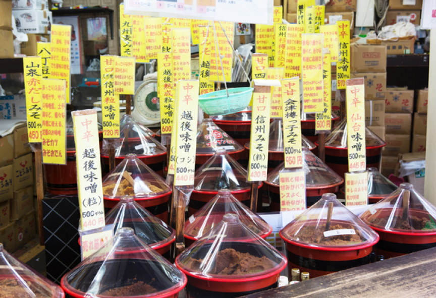 位于“十條富士見銀座商店街”入口處有一家“高柳味增專賣店”,售賣著從日本全國運送過來的各種味増,數量大約有28種之多。這家店將味增分別裝在木桶里并排售賣的樣子,應該是昭和時代最為普遍的售賣方式,多少令人有些懷念。來到這里,您可以將個人口味的喜好告訴店家,店主會非常熱情的向您推薦不同的味增。