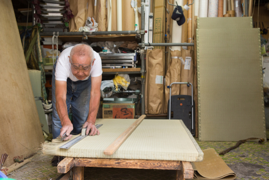 在“十條仲通商店會”中,我們遇見了正在進行更換榻榻米工作的店主。商店的右半部分銷售地毯和窗簾等現代的室內用品,左半部分是更換榻榻米的工作區。店主表示:“榻榻米的傳統到我這代人就不再盛行了,畢竟是夕陽產業,所以沒辦法。”隨著榻榻米文化的衰退,在商店街上看到店主那樣的工匠形象的機會也會隨之消失,一想到這一點,還不免有些悲涼呢。