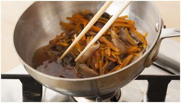 什錦食材:將干香菇浸泡在溫水中,變軟后,去掉根部,切成薄片。將胡蘿卜去皮后,切成細絲。將香菇入鍋放入水中,用小火煮10分鐘左右,然后加入胡蘿卜煮5分鐘左右,最后放入所有佐料一起煮,直到湯汁約剩兩湯匙左右為止。