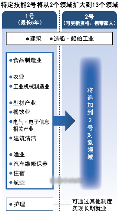 日本政府預測,到2023年度日本的勞動力缺口將達到34.5萬,如果取消特定技能簽證的期限,將有望緩解勞動力的缺口。擁有實踐經(jīng)驗、無需特別教育和培訓的人可以獲得最長5年的“1號”在留資格,如果通過考試確認擁有能擔任現(xiàn)場總管的熟練度,可以獲得“2號”在留資格。在留資格可以更新,家人也可以獲得逗留資格,在留達到10年就可以獲得永住權。此前這一措施僅限定在“建筑”、“造船·船舶工業(yè)”這2個領域,以后將擴大到“農(nóng)業(yè)”、“工業(yè)機械制造業(yè)”、“餐飲業(yè)”等14個行業(yè)。這樣在日本社會基層工作的一線員工,將有望成為“技術型人才”在日本長期在留,也可以獲得日本永住待遇了。