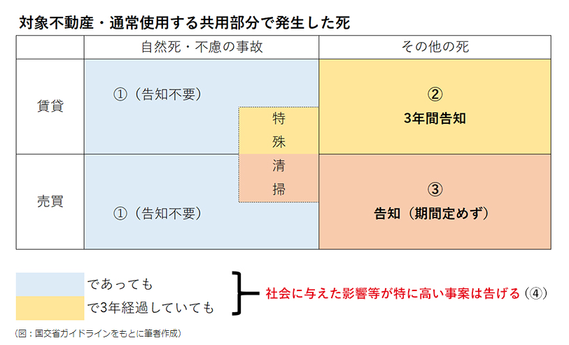 需要解釋的是,通常使用的共用部分是指公寓的入口、共用樓梯、共用走廊等。如果在這里發(fā)生的死亡,在一定情況下是需要告知的。相反的,上述3中的不把鄰接住戶和通常不使用的共用部分發(fā)生的死亡作為告知對(duì)象,所以要具體問(wèn)題具體分析。