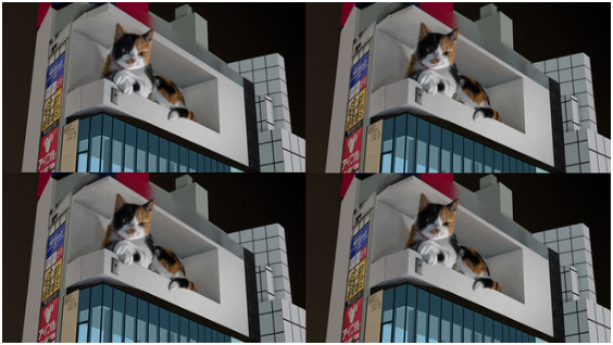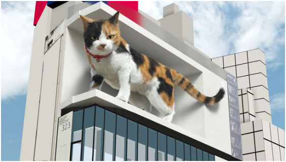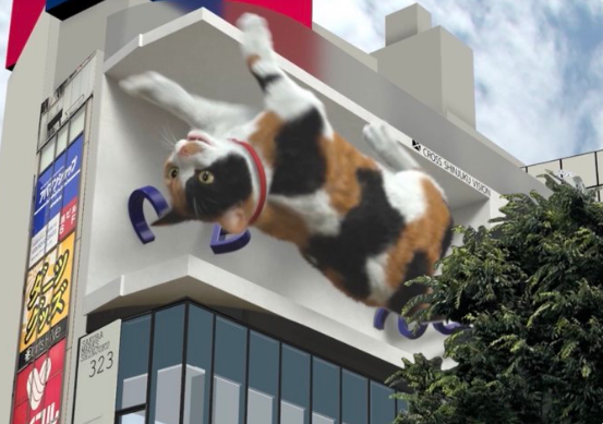 新宿貓的形象確定了,藤沼想到去年開(kāi)始利用クロス新宿ビジョン“L”型廣告屏播放3D廣告時(shí)曾引起熱議,所以想在疫情期間,讓路過(guò)的人能看到“眼前一亮”的動(dòng)畫(huà),于是3D立體巨型三花貓便出現(xiàn)了。