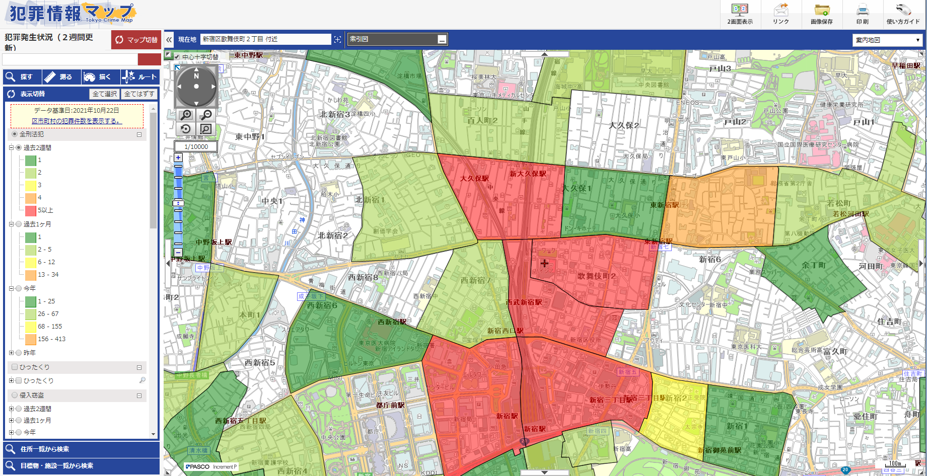 從上面的地圖可以看出,從新大久保、大久保、歌舞伎町到新宿的區域案件數量較多。飲食店、居酒屋、風俗街較多的地方,一般治安情況不夠好。如果想住治安好、安靜的地方可以考慮稍遠一點的街區。