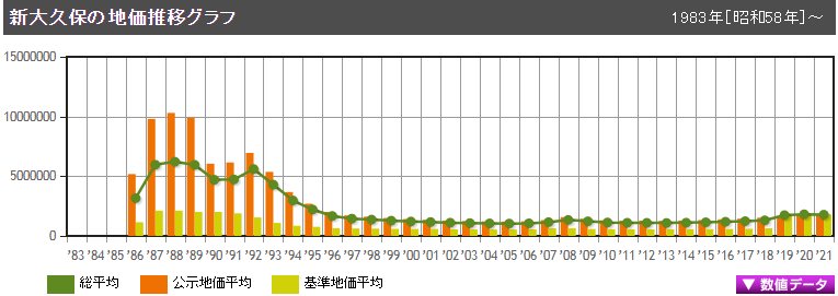 新大久保地區的地價近年來平穩上漲,2021年3月的公示地價為每平方米177.88萬日元。因受新冠肺炎疫情的影響,價格稍有下降但與往年相比,差異不大。