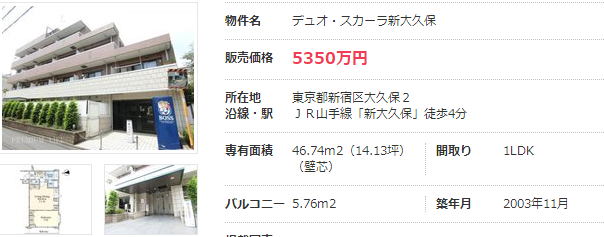新大久保車站周邊的商業設施較多,目前沒有新建公寓項目。一套建筑年代為2003年的二手房,距車站步行4分鐘,面積為46.74㎡,1LDK的售價為5350萬日元。