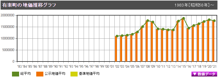 有樂町2021年3月公示的基準(zhǔn)地價為每平方米1766萬日元,近年來地價穩(wěn)中有升,因為疫情的原因稍有下跌,但地價水平在東京算是非常之高的了。