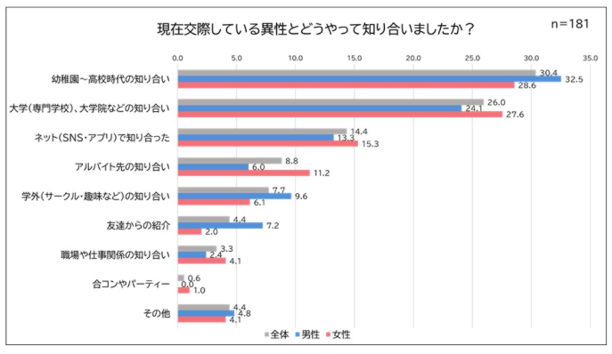 回答“幼兒園~高中時代的熟人”排名第1位( 30.4% ),“大學(專科學校)、研究生院等的熟人”排名第2位( 26.0% ),“通過網絡( SNS APP )認識”排名第3位( 14.4% ) 。去年排名第3位的答案是“打工地的熟人”,因為疫情肆虐影響了年輕人打工的機會,轉而通過網絡社交的人有所增加。