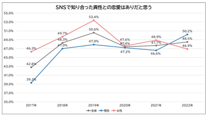 全體48.5%的人認為“有”。 從男女比率來看,男性占50.2%,女性占46.9%。 與過去5年的結果相比,男性首次超過了女性。這主要也是因為疫情,日本政府多次發(fā)布的緊急事態(tài)宣言等防疫措施,自宅在家的時間過多,讓更多的男青年想要戀愛了。