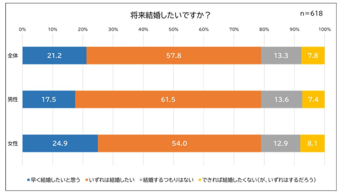 回答“想早點結婚”的有21.2%,“總有一天想結婚”的有57.8%。 對于這一有關婚姻觀的問題,去年的調查結果是歷史最低的73.8%,今年呈現(xiàn)出上升的趨勢,這與日本的“羈絆婚姻”觀也有很大的關聯(lián)性。