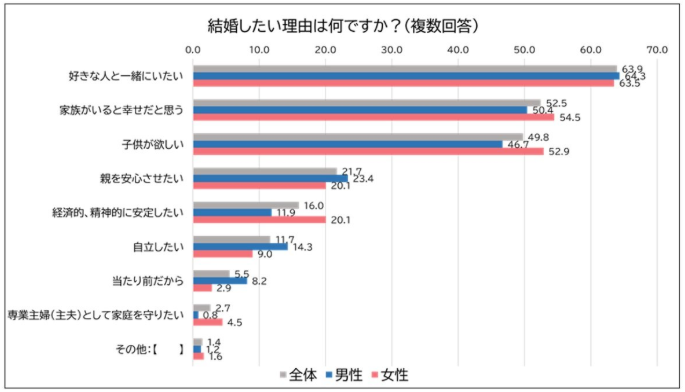 回答最多的是“想和喜歡的人在一起”( 63.9% ),其次是“有家人才幸福”( 52.5% )、“想要孩子”( 49.8% )。現(xiàn)在日本年輕人結婚不講究“有房有車有彩禮”,更多的人是因為喜歡對方而選擇結婚的,結婚的理由樸素又真誠。