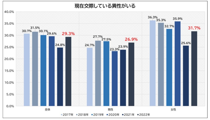 回答“有”的人占29.3%,前一年曾大幅下跌至24.8%,但今年指標有所恢復。如果將調查時間向前推至1996年, 有正在交往的對象的比例為50.0%。調查公司認為近年來交往比率大幅下降主要原因是年輕人的草(tang)食(ping)化導致連正常的戀愛都不想談了,不過這樣趨勢在本次調查中有所緩解。