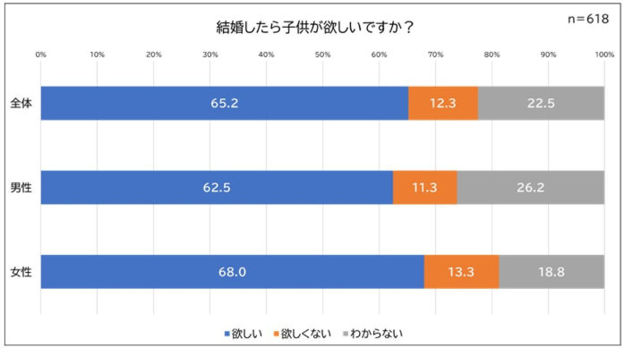 回答“想要”的有65.2%,“不想要”的有12.3%,“不知道”的有22.5%。 約占2成的人回答“不知道”,調查公司分析認為“有很多人在新成人階段無法想象將來結婚后還會有孩子這件事”。