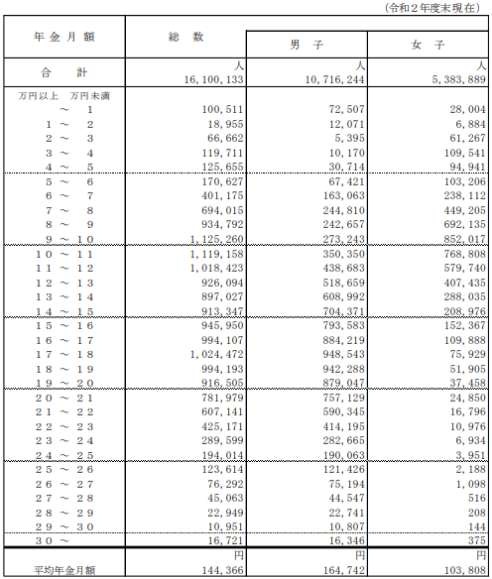 由上表可以看出厚生年金每個月領(lǐng)取9~10萬日元的人最多,而平均月領(lǐng)取額為14萬4366日元,看來很多人的月養(yǎng)老金未達(dá)到平均額。