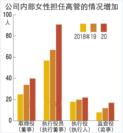 根據經濟合作與發展組織(OECD)的調查數據顯示,上市企業的女性董事占比法國為45%,美國為26%,而日本僅為8%。雖然女性高管在日本的企業中近年來有所增加,但整體改善情況并不理想。截至2020年7月1日,全日本的女性高管,包括取締役(董事)、執行役員(執行董事)、執行役(執行人)和監查役(監事)僅有170人。在歐美,有女性董事的企業占到90%左右,而在日本近40%的企業沒有女性董事。為了改善這一情況,日本企業最近加大了增加女性高管的速度,對于有能力有意愿晉升的女性是一個有利時機。