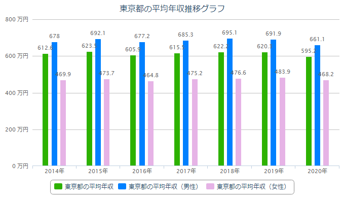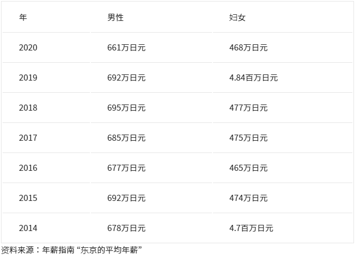 日本男女收入差距大。距離來說,2020年東京都的平均年薪,男性為661萬日元、女性為468萬日元。連續多年來日本全國平均年薪男女比例情況也大體相同,日本女性薪資約為男性的70%左右,而歐洲主要國家則超過80%,相比之下存在較大差異。