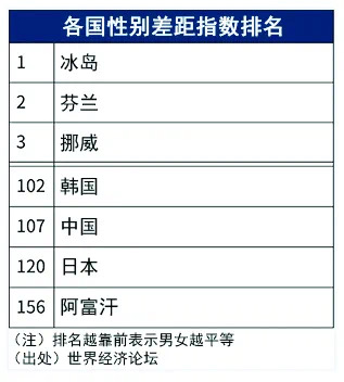 根據世界經濟論壇(WEF)發布的“性別差距指數”排行榜中可以顯示各個國家實現男女平等的程度。日本在2020年度參與調查的156個國家中,排名第120位。日本女性在政治及經濟參與度等方面明顯落后,大大降低了日本的排名。