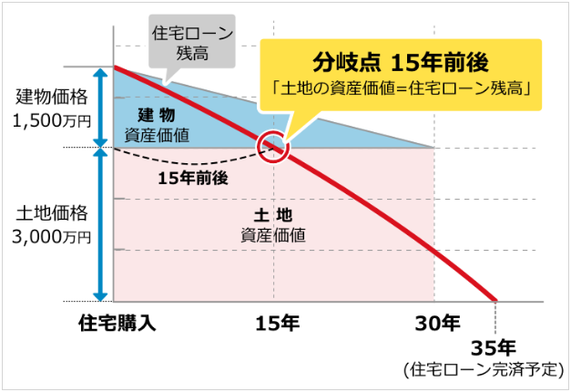 假設同樣在郊區購買了價值4500萬日元的房產,其中土地價值1500萬及地上建筑3000萬,貸款35年,貸款按固定利率2.5%計算。