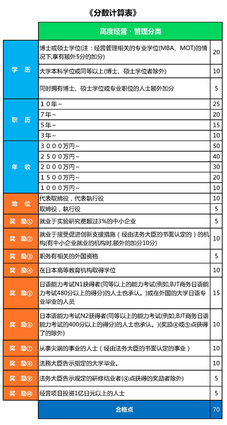 ?如果年齡超過30歲,在日本沒有留過學(xué)也沒有語言成績的情況下也沒關(guān)系,用高收入來平衡就可以。比如在日本所注冊的公司經(jīng)營狀況良好,年收入達(dá)到3000萬日元的話,一下子就可以得到50分了,其他再隨便一點(diǎn)加分,達(dá)到70分也就不難了。