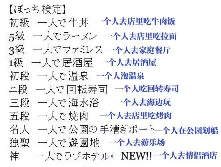 “孤獨的美食家”、“一人樣”、“一人食”、“一人份”、“一人暮”……屬于單身人士的專有名詞在日本越來越多的被發明和使用,同時日本的單身經濟也隨之越來越成熟。幾年前,日本對一個人的孤獨分了不同的等級,我們小編已經到三段了,大家可以對照一下,了解自己的孤獨程度。