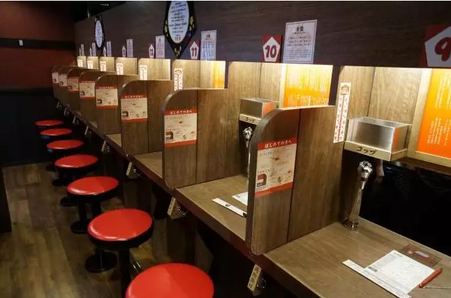 比如適合一個人用餐的隔斷式餐位,就是專門為單身食客準備的。因為餐廳里大多是4人位的餐桌,后來也出現了2人位的餐桌,但是當一個人吃飯的時候,有可能會一個人占了整張桌子,因為日本沒有“拼桌”的習慣,單身食客往往覺得自己占了便宜、浪費了資源、給店家造成了損失,有額外的精神負擔,所以在隔斷式一人餐位用餐時,就會感到輕松自在多了。