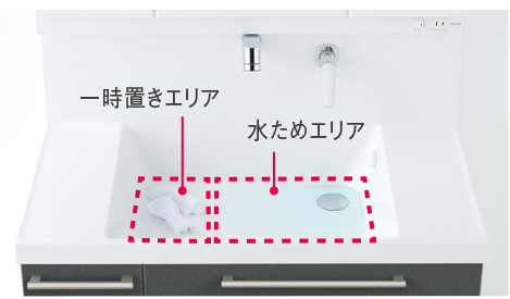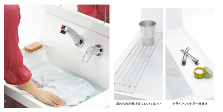 洗面臺(tái)除了刷牙洗臉外,在手洗衣服時(shí)也會(huì)經(jīng)常被使用,所以不用小盆而直接在洗面盆里洗衣服的功能也非常重要,特別是有孩子的家庭。日本的洗面臺(tái)水盆底部一般都會(huì)設(shè)計(jì)成有一定的傾斜角度,這樣一方面可以有效增加排水的效率,讓頭發(fā)等容易隨著水流一起溜走,便于清潔;另一方面在洗衣服時(shí)可以同時(shí)享有清洗區(qū)域和臨時(shí)放置區(qū)域,手洗內(nèi)衣或襪子等小衣物時(shí)就變得輕松、方便多了。