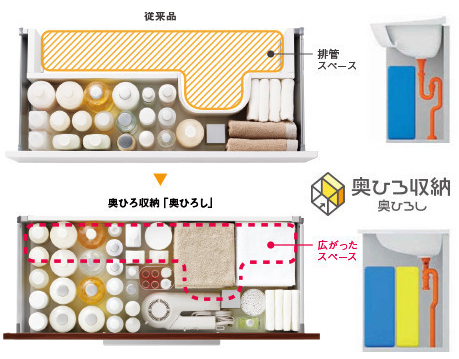 除了鏡箱下面增加了儲(chǔ)物格,就連常規(guī)的水盆下方的儲(chǔ)物空間也可以增加,不過是將排水孔及排水管位置后移,僅僅是個(gè)小改動(dòng),儲(chǔ)物空間就瞬間增大了,而且看起來更方正還好用了,收納功能超群。