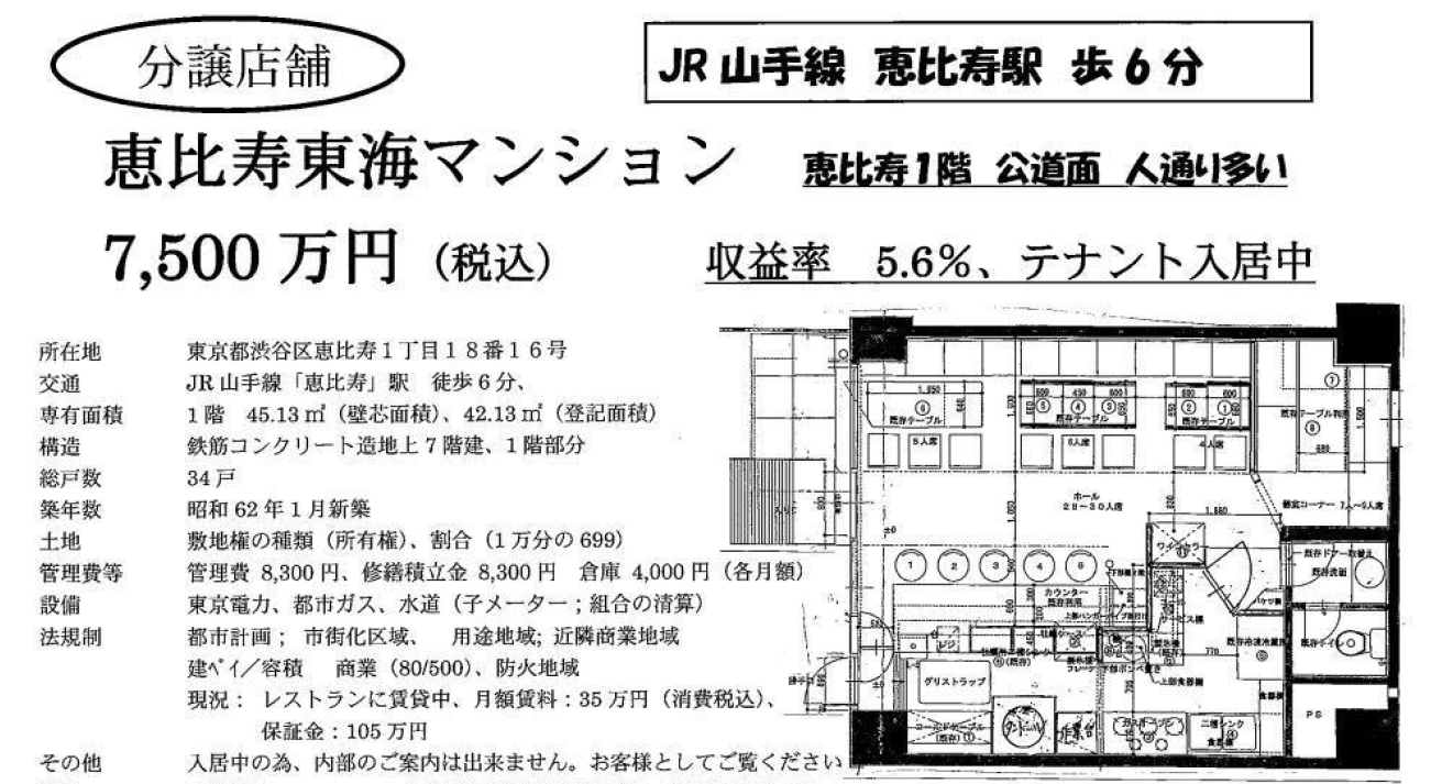 涉谷區的惠比壽是東京都內比較人氣的地區之一,這個建于1987年,面積僅45.13平方米的店鋪售價為7,500萬日元,每平米約166萬(約合人民幣11萬元),每個月的租金可達35萬日元,收益率5.6%,由于這個店鋪的售價在東京都內相對算是比較優惠的,表面回報相對也較高。