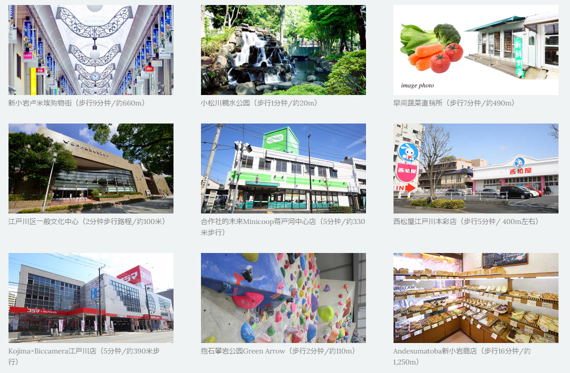 距小松川親水公園(步行1分鐘/約20m)、新小巖盧米埃購物街(步行9分鐘/約660m)、江戸川區一般文化中心(2分鐘步行路程/約100米)、早間蔬菜直銷所(步行7分鐘/約490m)、Kojima×Biccamera江戸川店(5分鐘/約390米步行)、抱石攀巖公園Green Arrow(步行2分鐘/約110m)