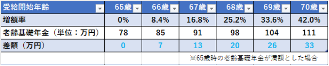 此前延期領(lǐng)取的增額率以月為單位,以每月0.7%的比例增加。 也就是說,晚一年66歲領(lǐng)取的話,1年=12個月×0.7%,增額率為8.4%。最晚領(lǐng)取的時間是70歲,所以最多可增加42%。也就是說70歲開始領(lǐng)取的話年金額會增加33萬。