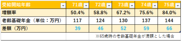 而規(guī)則修訂后,開始領(lǐng)取的年齡延長到75歲,所以如果75歲領(lǐng)取養(yǎng)老金的話,最多會增加84%。如下表所示,自令和4年4月以后最大增加額為66萬。