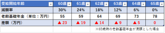 此前的規(guī)則下,提前領(lǐng)取情況下的減額率以月為單位,以每月0.5%的比例減額。也就是說,提前一年到64歲領(lǐng)取的話,1年=12個月×0.5%,減幅率為6%。最早可以領(lǐng)取的年齡是60歲,最多可以減少30%。 實際上金額能差多少呢,如下表中總結(jié)。 如果從60歲開始支付的話,最多會減少23萬日元,退休金基數(shù)也相應(yīng)減少。