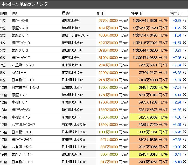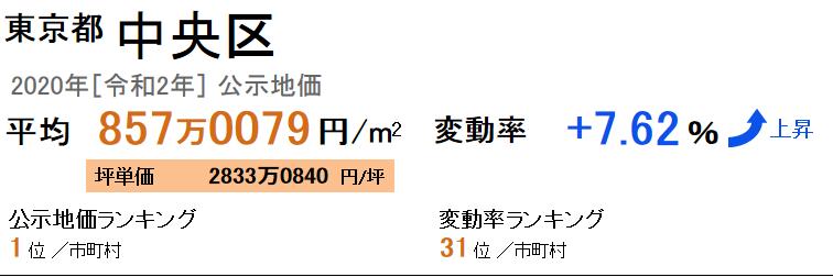 中央?yún)^(qū)的最新基準(zhǔn)地價(jià)平均價(jià)格為610萬7129日元/㎡(2019年(令和元年),坪單價(jià)平均為2018萬8856日元/坪,全國排名第一。從上一年開始的變動(dòng)率是+9.13%,變動(dòng)率的全國排名是第15位。
