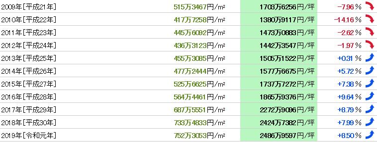 中央?yún)^(qū)實(shí)際實(shí)行的不動(dòng)產(chǎn)交易的價(jià)格(國土交通省)中,僅限于不含建筑物的土地買賣,計(jì)算出了平均價(jià)格。因?yàn)槭菍?shí)際進(jìn)行的不動(dòng)產(chǎn)交易價(jià)格,所以和實(shí)際價(jià)格近似。中央?yún)^(qū)的土地交易價(jià)格2019年(平成31年)第一季度~第二季度,平方米單價(jià)427萬7500日元/㎡,坪單價(jià)1414萬0495日元/坪,前年變動(dòng)率+57.76%。該平均交易價(jià)格與上述公布的公示地價(jià)、基準(zhǔn)地價(jià)的平均值相比,有43.14%的差距。