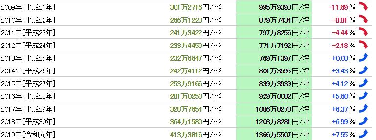 從1983年(昭和58年)開始的37年的數據,公示地價的最高價格是1179萬5625日元/㎡(1991年),最低價格是209萬6413日元/㎡(2001年),兩者的差距是5.63倍。基準地價的最高價格是967萬日元/㎡(1985年),最低價格是152萬4444日元/㎡(2001年),兩者的差距是6.34倍。