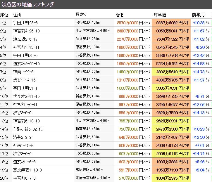 東京都涉谷區的最新基準地價平均為392萬2142日元/㎡(2019年令和元年),坪單價平均為1296萬5761日元/坪,全國排名第4。從去年開始的變動率是+7.85%,變動率的全國排名是第25位。